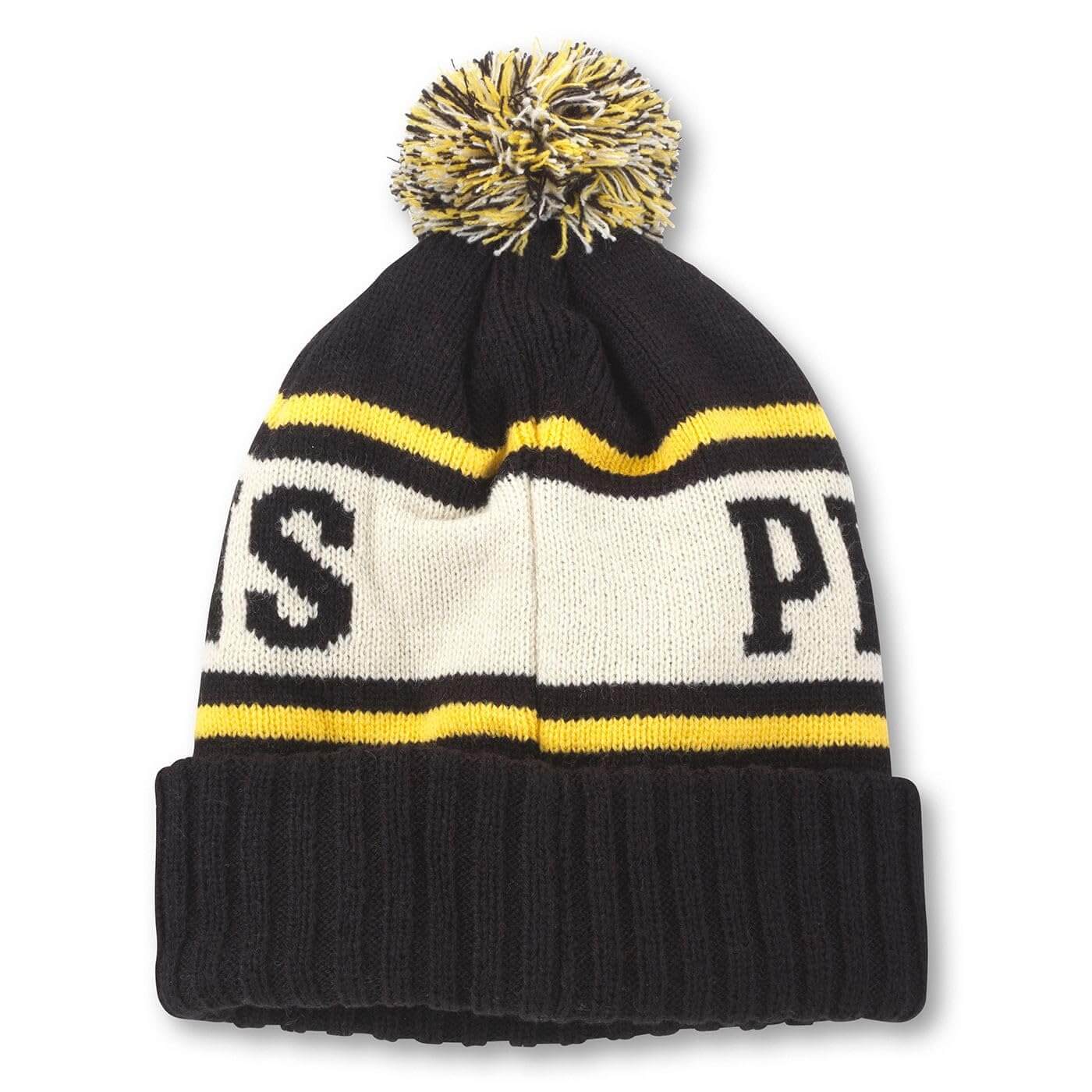 - Look and feel great with this classic and always trendy cuffed pom beanie. This sporty knit cap has a cuffed brim so that when worn, it sits nicely on the head and has a tri-colored pom